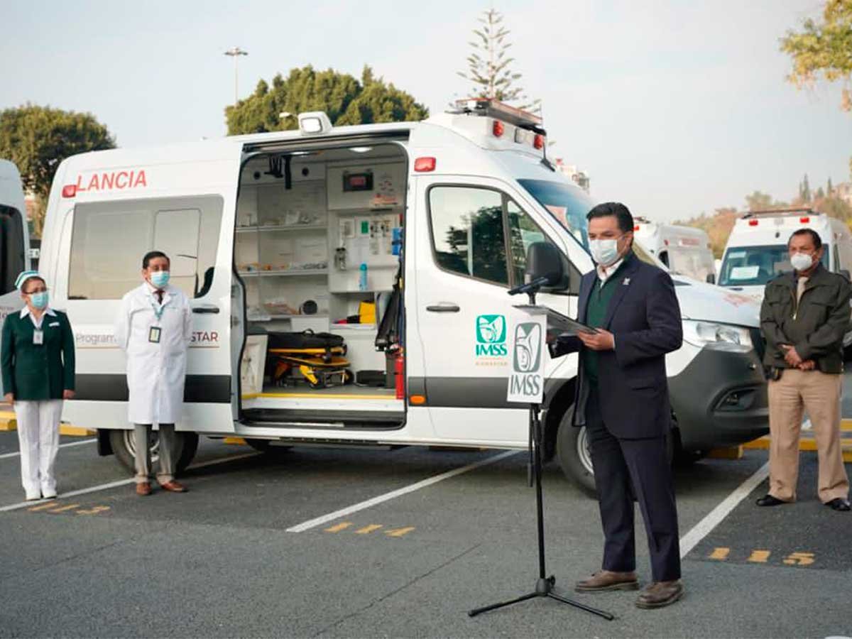 El titular del IMSS, Zoé Robledo, destaca el equipo que integran los vehículos como un desfibrilador y un …